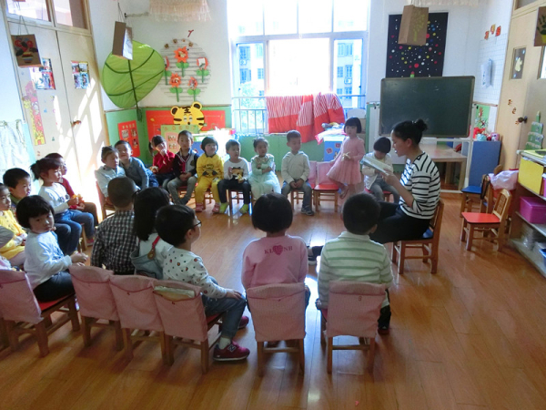图为:志愿者给小朋友们讲故事