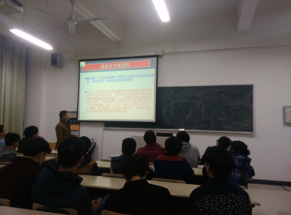 2015年4月8日晚6点半,电气3141班于海天楼506教室召开了青春健康教育课程,此次课程由志愿者指导中心成员胡继超同学担任讲解人。 一开始胡继超向同学们介绍艾滋病的危害和艾滋病是如何破坏人体免疫功能,然后介绍人体免疫细胞——白细胞通过吞噬和产生抗体等方式来抵御和消灭入侵的病原微生物,以此强调艾滋病毒的严重性。课件十分详细地表达了艾滋病的各种传播途径及其危害程度。通过常年的观察统计,人们得出艾滋病有三种前兆:一,感染者会出现病毒血症及免疫系统急性损伤所产生的临床症状;二,淋巴结肿大,多见于颈后、颌下或腋下;三,皮肤损坏,如皮疹、全身瘙痒等。在感染艾滋病毒2-12周才能经过检测诊断感染,通常艾滋病的潜伏期5-10年不等,平均7年。