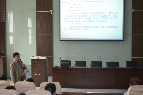 讲座的开展是为了创建平安校园,维护大学生的人身、财产安全,提高大学生的安全防范意识与自我保护能力。徐作义教授首先就诈骗方式对我们进行了讲述,其中包括了网络诈骗、电话诈骗、短信诈骗等一系列的诈骗方式。其次讲述开学近1个月,在宁波大学发生的高达50起诈骗案例,其中被骗的原因也是多种多样,包括许多主观和客观的原因,并指出了校园安全教育工作的紧迫性和必要性。最后,教授就我们该如何防范诈骗,及我们今后的生活加以提醒和建议。