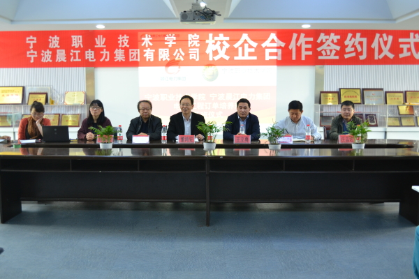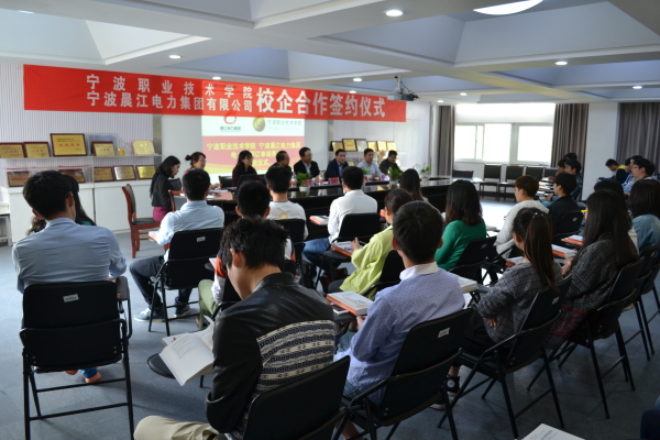 2015年4月16号下午13:30,我校在敬业楼3楼会议室隆重举行与宁波晨江电力集团有限公司校企合作的签约仪式,暨电力工程订单培养班开班仪式。出席本次仪式的有宁波晨江电力集团有限公司总经理王立勇,工商学院院长董鸿安老师,工商学院副院长叶陆艳老师等。