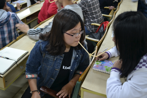 为了提高学生会干事的素质及能力,培养学生干事的团队协作意识。4月16日晚上8点,宁波职业技术学院工商学院第四期团学培训活动在明德楼307教室举行,本次活动由工商学院组织部部长释彤和纪检部部长王诗洁共同策划。 首先,在上期游戏中落后的干事们履行了游戏惩罚,她们选择演唱一首《十年》,献给在座的学员们。欢声笑语后,游戏活动正式开始。规则是每人会分发到一根吸管,用吸管将洋葱圈依次传递给队友,共进行3轮游戏比赛。第一轮是用吸管从前往后传递一个洋葱圈,最后一组的同学将接受男生10个俯卧撑,女生20个深蹲的惩罚。第二轮则是用吸管从后往前传递两个洋葱圈,难度加大,惩罚也翻倍。第三轮仍用吸管从前往后传递,但是洋葱圈的数量达到三个,惩罚更是翻了一翻。