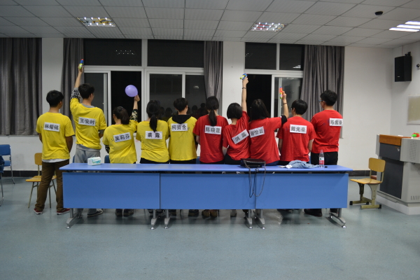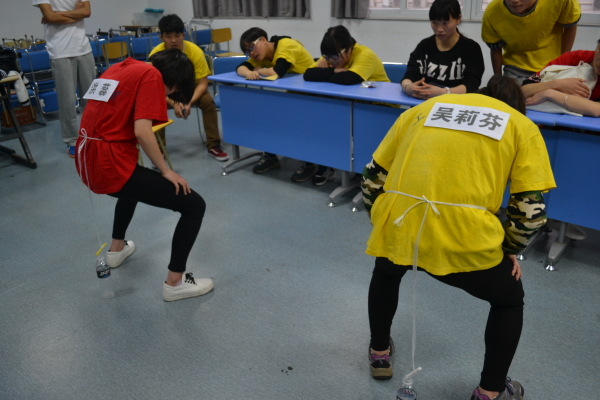 第二轮比赛则分为好几个小项目。分别有“头顶倒水”、“推瓶盖”、“指压板跳绳”、“飞镖”和“钓瓶子”。比赛过程中,两队的实力不相上下,双方队员互不相让,教室里的氛围紧张而刺激。最后黄队在此轮中又略胜一筹。