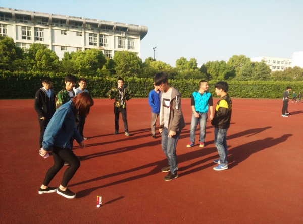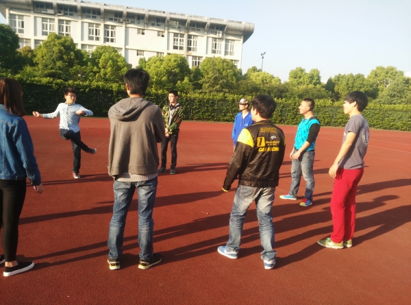 在活动开始后,所有学生会干事们便开始了跑步热身。随着热身的结束,真正的晨练活动的项目才刚刚开始。由陈良峰组织的“毽子接力”的活动项目对于基本上都是男生的学生会干事们来说无疑是个挑战,更重要的是除了踢毽子之外,最为关键的还是队友们之间的默契配合与团队协作。