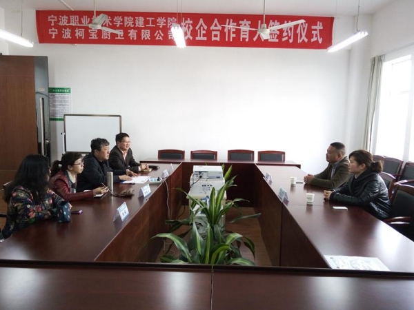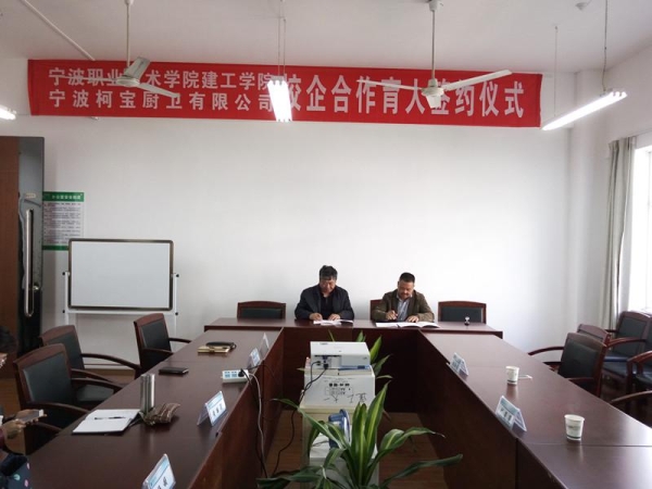 2015年4月22日14点,宁波职业技术学院建工学院与宁波柯宝厨卫有限公司校企合作育人签约仪式在有为楼211会议室举行。宁波柯宝厨卫有限公司副总经理朱红星、人事部经理邱斐斐,建工学院李晓东院长、黄丽莉副院长,党总支书记丁立人以及建工学院建装专业杨赪主任参加了签约仪式。