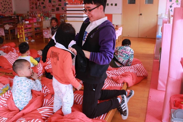 据悉,志愿者们到达幼儿园的时候,孩子们还在午睡。志愿者们便在一个教室休息,同时也参观了他们的教室。教室上面贴满了他们的作品,有些显得天马行空,但这也突出了他们天真、纯粹的心。周边还有老师为他们做的许多过家家手工小房间。当孩子们醒后,志愿者们便分成了两人一组,分别到各班帮孩子们穿戴好衣服,以及帮助老师叠被子、收拾床铺。
