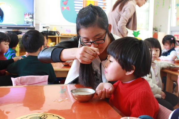 图为:志愿者在喂小朋友喝粥