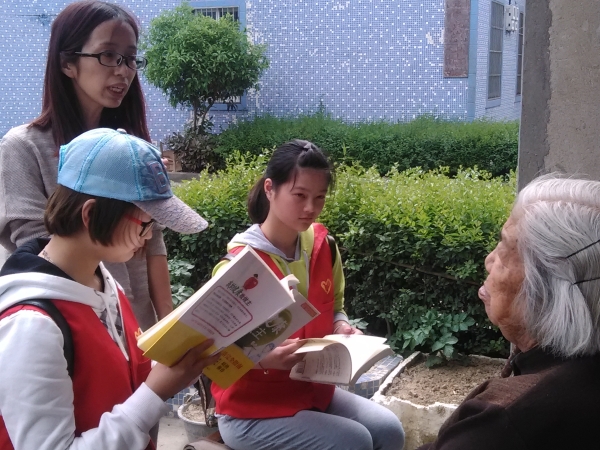 在社区的街道上漫步行走,大家不时能看到一位、两位或多位满头白发的老人家坐在屋檐下纳凉。当他们看到一个个身穿红衣的志愿者走来时脸上都会露出一丝丝和蔼的笑容。这时,同学们脸上都会表露出亲切的笑容上前,将手中的安全、交通、民事的知识小册递到老爷爷、老奶奶的手中并细心的讲解,双方不时传来阵阵的交谈声。不止如此,志愿者们将准备好的老年人保健书籍拿出,坐在老人身边贴心的讲解。如“每天保持吃一个鸡蛋”,“多吃豆制品、腰果、核桃具有丰富蛋白质的制品”,“要注意荤素的平衡,平时要多晒晒太阳”……听着志愿者们一句又一句的问唠,老人的脸上不由地露出丝丝的微笑。