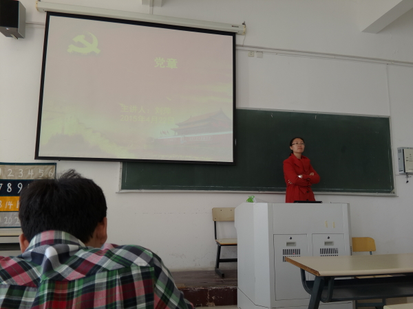 刘萍老师带着精心准备的PPT向同学们讲解。一开始,从党章的基本含义入手,党章是党的章程的简称,它是政党内部最基本和最高的政治行为规范,是一个政党的政治态度和组织形态的集中体现,是完备的政党组织所不可缺少的。党章是立党治党管党的总章程,是中国共产党为实现党的纲领所制定的,是党的各级组织和全体党员必须严格遵守的基本准则和规定。接着,刘老师介绍:世界上第一个无产阶级政党的党纲——《共产主义者同盟章程》。党章不仅有久远的历史,其的地位更是不可小觑,党章是党的整体意志的体现,是党内的普遍行为规范,是具有最高权威和最大约束力的党内法规。邓小平同志曾说过:国要有国法,党要有党规党法,党章是最根本的党规党法。胡锦涛同志曾指出:党章是把握党的正确政治方向的根本准则,是党员加强党性修养的根本标准,是坚持从严治党方针的根本依据。以此,我们可以看出党章具有非常强大的作用,不仅保证全党在思想上、政治上、组织上、作风上、行动上的一致,更是党存在、发展和夺取胜利的一个基本条件。