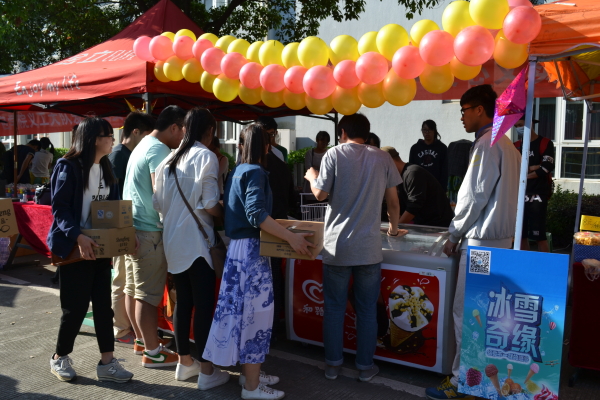 当义卖物资到达时,干事们都上前帮忙,抬冰柜、搬棒冰,并协助摆放、整理。所有物品都在八点义卖开始前梳理完毕,一切都得益于干事们的协助。尽管天气有些炎热,但他们还是卖力的吆喝,向路过的同学、老师极力介绍、推荐美食。栗子一批批的脱销,拿栗子的干事一趟趟的跑去小夜市,且毫无怨言。很快,一天的义卖在一场突如其来的小雨中匆匆结束,但部分干事还是留在摊位上,直到清理完卫生,收拾完东西才离开。