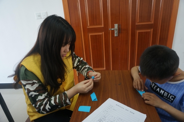 像往常一样,志愿者们分成两组,分别在楼上楼下的两个教室里,和小朋友们学习与互动。第一节课开始,楼下小朋友比较多,大家基本都围坐在大桌子旁边,而两个志愿者则坐在小朋友们中间,为他们答疑解惑,小朋友们更是非常积极地向小老师们提问求解。楼上的教室比较小,小孩子也相对较少,不过学习氛围丝毫不减一楼。志愿者刚为一个小朋友解答完,就被另一个小朋友呼唤着去解惑了。忙碌的同时感受到的满是孩子们对学习的渴望与求真。