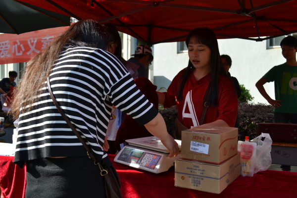 图为:义卖前准备 上午九点,负责销售的同学热情地吆喝叫卖,顾客也蜂拥而至。“炎热的天气,配上火辣辣的心情,带上栗子一起去旅行吧”,糖炒栗子的广告词吸引了不少同学前来争相购买,栗子屡次脱销,供不应求,很多同学都选择提前预订,不想错过美味。冰雪奇缘的冰激凌在这炎热的天气里也是最好的搭配。摊位前的顾客来了一批又一批,销售的同学持续热情地为顾客介绍各类商品。收银的同学有条不紊的收着代金券,并将每一单都仔细地记录下来。