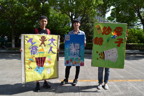 图为:干事举广告牌推销 此次义卖所得善款将全款捐献给思源基金会,用来资助在校贫困学生,补贴生活费和学费,努力不让任何一位学生因贫困而辍学。饮水思源,让爱心永远传递下去。在此,热烈祝贺本届校庆嘉年华活动圆满成功! 工商学院 张璐/文 张璐、冯依璐/摄
