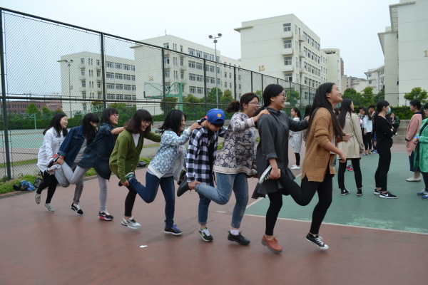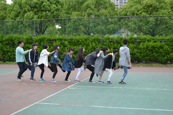 为增强学生会各部门干事的凝聚力,增进各部门之间的感情。2015年4月27日下午4点40分,工商学院第四次户外团学培训活动在排球场进行。此次活动由生活部和文娱部的干事共同组织策划。 各小组成员准时到达集合地点,签到并排队。随后,文娱部的干事开始介绍本次活动游戏规则。每个小组安排十个人排成一列,每个人抬起一只脚,让身后的人拉着前一个人的脚,依次搭肩,并且在指定位置安排人4位组员接龙,以单脚跳跃的方式到达终点,最后计算每个小组用时决出胜负。在活动正式开始前,每个组都有5分钟的练习时间,大家争分夺秒,努力找到最快捷的前进方式。