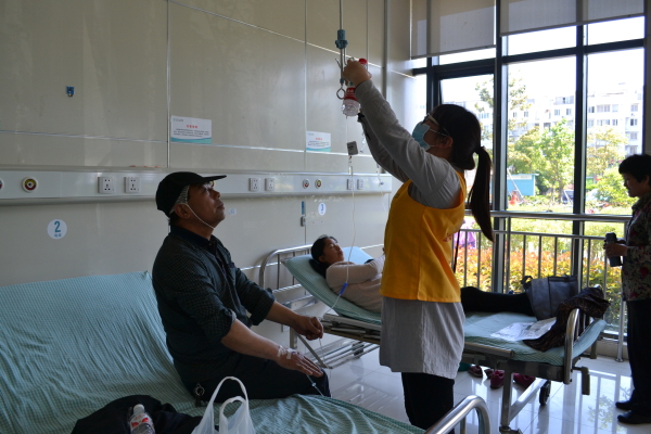 图为:志愿者正在帮病患挂吊瓶