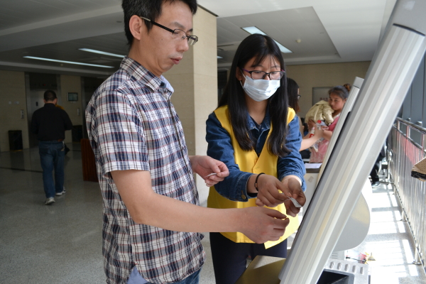 在自动挂号区,志愿者耐心地帮助需要挂号的病患挂号;输液大厅里,志愿者帮助那些在输液的病患们拎吊瓶,按铃;取化验单处的志愿者们积极地帮助病患们取化验单,让他们及时的拿到自己的化验结果;指路的志愿者也耐心地为病患指路,避免病患走冤枉路。
