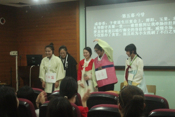 活动伊始,主持人便用韩语作了开场白,同时热烈邀请表演的同学们上场。同学们的表演方式也是五花八门,层出不穷。有的同学独自上台,站在聚光灯下幻灯机前,用韩语介绍着韩国的风土人情。有的同学两两成对,以幽默诙谐的方式上演一番在韩国发生的小故事。在这里,你会听到熟悉的“欧巴”、“肯恰那”、“拜里卡”、“昂对”等平时耳熟能详的韩语。当然,你也会深深陶醉在这韩语的魅力之中。有的同学身着韩服,上演一场在韩国大街小巷都有人熟知的《春香传》,生动的演技再加上韩语对白,让在场的人都不禁大声叫好。有的同学统一身着黑色正装,上演一场生动的情景剧。剧情的跌宕起伏真真是让在场的人有一种观看韩剧的即视感。有的同学以一曲韩文歌曲夺得全场呼声。这样一场演讲比赛堪堪赛出了韩国歌谣大赏的味道。