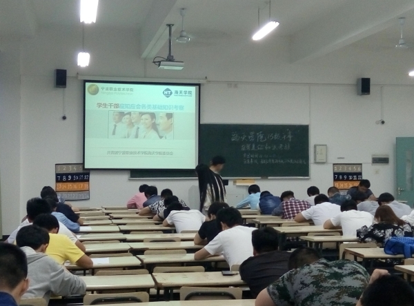 当试卷发下来的一刻,所有同学紧张地拿起笔,快速写好班级姓名,然后仔细审阅题目,虽然内容都是基础的题目,但是并不是所有同学都能流畅回答,比如“图书馆的全称是什么?”、“根据14级学生手册对于志愿服务时间最新规定,描述正确的应该是哪个选项?”以及“宁波职业技术学院校级共青团组织的全称是什么?”等等诸如此类问题,而试卷的主观题中提到“很多学生干部惰性越来越明显,奋斗目标慢慢淡化”这样的实际题目。对于基础知识,很多同学并不知道正确答案,全体交卷之后,大家陷入了反思,这些并不是难题,都是作为一个学生干事应该要了解的,但是为什么自己还不够了解。