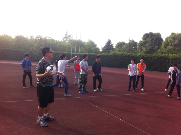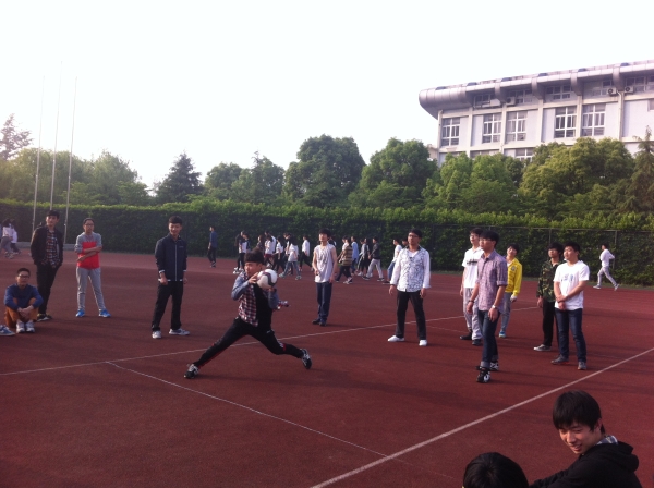 图为:晨练现场 经过多次晨练,学生干事已经没有第一次热身跑步之后气喘吁吁的样子,轻松跑完一圈之后,我们的晨练游戏开始。此次晨练游戏是“保护公主”,四个女生各领一队,所有队员站在相应的圈子内躲避对方的攻击球,砸中男生则男生到对手圈子外面,砸中女生则队伍输掉。比赛时,双方队员绷紧神经,不敢有疏忽,虽然在比赛时同学们情绪高涨有时会失手砸痛对方同学,但是大家都一笑而过,没有任何的愤怒和抱怨。经过圈内男生和圈外男生的默契配合,比赛很快有了结果。