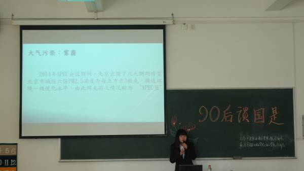 之后,刘俊秀同学又为我们带来了她对生态环境保护的演讲。她的演讲主要分为两部分——雾霾与水污染,刘同学分别介绍了两种污染的形成、对我们生活的影响以及国家有关部门的治理方法,