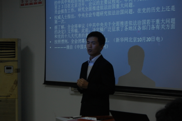 为促进同学们关注时事政治,增强法制教育理念。5月7号晚上6点20分,马研会宣讲团于4号有为楼313教室举行“90后谈国事”宣讲活动。本次宣讲人为马研会的范丽媛同学、管航宇同学,两位同学以十八届三中全会中的“依法治国”为主题,从不同的角度阐述了它的内容、实质。