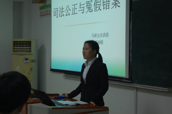 短短的一个小时的马研会不仅为大家分析了经典的案例,增长了法律知识,更重要的是提高了我们的法制理念。马研会的宣讲是化工学院的同学们知道正义的重要性;每个政党,每个民族,每个人在正义面前都不应该沉默,必须站出来,世界上才有正义可言。相信在不久的未来,有更多的化工学子自主实际地了解法律的作用,将其运用于生活,实现依法治国的伟大目标。