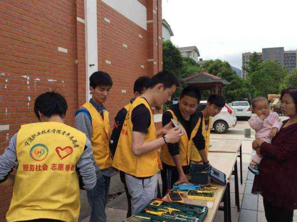为更好地将所学知识付诸实践,将我院的志愿服务精神传递到社会。2015年5月10日,电信学院 “爱心维修站”到凤凰社区进行小家电义务维修活动。