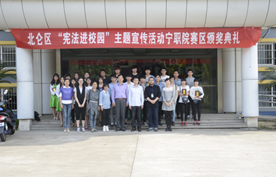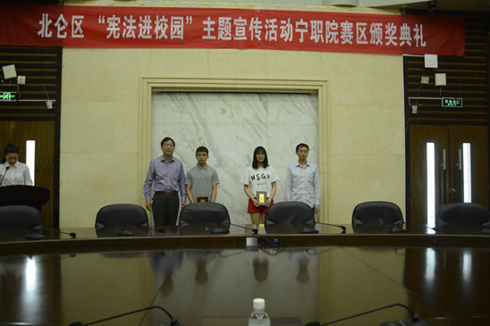 2015年5月13日下午在国际会议厅举行了北仑区“宪法进校园”主题宣传活动宁职院赛区颁奖典礼.艺术学院积极组织大学生参与各项比赛,并涌现出了一批优秀的文化作品。每一位到场的嘉宾与同学对此次颁奖典礼充满了热切的期待。原北仑区人大副主任、产学合作办公室主任邬学枚教授、北仑区司法局副局长刘德方、宁波职业技术学院艺术学院执行院长胡成明老师、艺术学院直属党支部副书记赖敏雅老师、北仑区司法局科长殷春红、宁职院视觉传达专业主任胡承武老师、艺术学院分团委书记屠琳琳老师、北仑区司法局卞玉洁出席此次颁奖典礼。