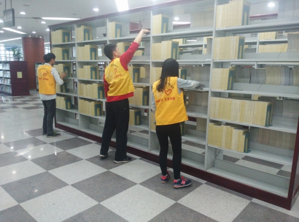 2015年5月14日下午一时许,于校图书馆,来自海天学院的学子于今天在此展开图书馆打扫的志愿者活动。本次志愿者由来自志愿者指导中心的干事沈学铭担任领队,带领其余四名志愿者开展志愿者活动。