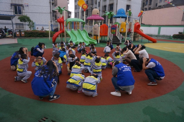 小朋友们都听得十分认真,底下讨论声此起彼伏。有的小朋友还积极发表看法,说自己知道地震来了要赶快跑,一边还做出抱头的姿势。真是让人忍俊不禁。随着园长一声令下,义工小组赶忙双手抱头。其中带队人金亚琪以身示范,双手抱头,嘴里喊着“抱头!快跑!”而小朋友们也都自觉地排成长队,双手抱头,紧跟着最前面的义工,小跑着出了教室。来到稍远的操场,小朋友们抱着头,做着下蹲动作,谨记着义工的叮嘱。