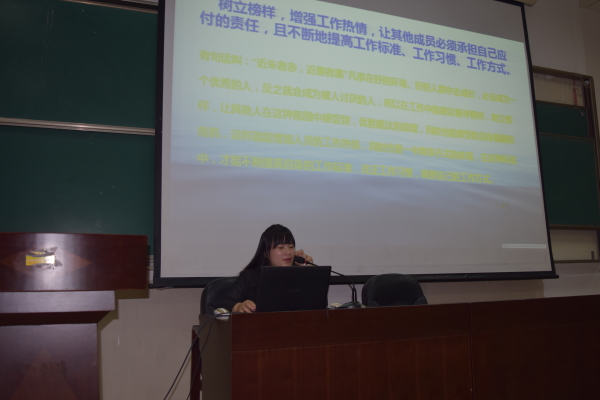 会议伊始,组织部部长庄莎莎由“一头狮子带领的羊群可以打败一只羊带领的狮群”小故事的引导下切入了正题。分别从完善自己、提高自我的管理意识、树立集体荣誉意识、担当责任、善于沟通等七个方面为我们讲解了管理者既要加强学习、提高素质;同时要树立良好形象,加强管理。要注重严于律己,以身作则。组织部部长庄莎莎表示:“我们根据不同的性格和爱好,就采取不同的沟通方式。让生活在这个集体里的人真切地、深深地体会到集体的温馨和幸福。因为只有管理者身先力行,携手大家共同去创造,共同去努力营造,我们才会有一个良好的、和谐的工作团队,所以每一个成员才会格外珍惜这个温馨的和谐的大集体,并把它视为幸福的“家”。”最后,庄莎莎与干事们进行互动,让大家畅聊在学生会的收获,干事们在一片欢乐中进行相互沟通、交流。