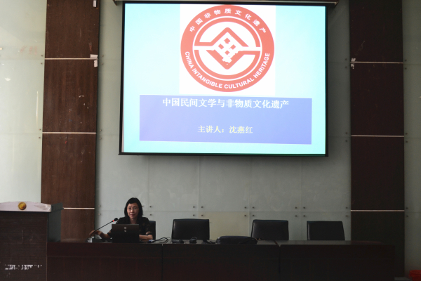图为:沈燕红老师正为同学们讲课 紧接着,讲到“非物质文化遗产”的部分,沈燕红老师着重指出保护“非遗”的重要性和紧迫性。她说,20世纪人类对传统文化的破坏之大令人震惊,保护“非遗”迫在眉睫。她还向同学们介绍了非物质文化遗产的项目和保护条例。最后,沈燕红老师播放了一段关于世界遗产的视频,希望同学们能在课余时间多了解民间文学与非物质文化遗产这些方面的知识。