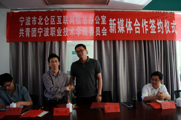 为促进宁波市北仑区互联网信息办公室与共青团宁波职业技术学院委员会就新媒体方面的交流与合作。5月12日下午15点30分,我院于学生事务中心办公室召开新媒体合作协议签署仪式。宁波市北仑区互联网信息办公室主任王立,互联网信息办干部陈乙丁、赵华奇与我院院团委书记励宁老师出席本次会议。