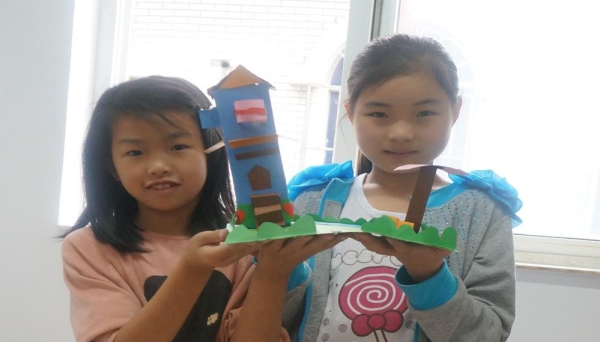 图为:志愿者和小朋友手工课成品