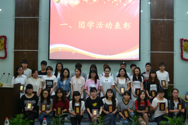 图为:获个人奖干事合影 大会进入到第二阶段,团学培训回顾的视频记录了干事们的成长。杜凌娜上台对本期团学培训工作作出总结。她对干事们在本期团学培训中的表现表示认可,同时提出了几点要求,并宣读本期团学培训优秀学员的名单,由沃意琳老师为他们颁发奖状。优秀学员代表叶越越同学上台发言,她发表了参加本期团学培训的心得并对学姐学长及老师们的悉心教导表达感谢。