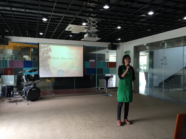第一位上台演讲的是北仑银泰城星巴克店长阮晶晶,首先她发给每位同学一杯星巴克咖啡,告诉同学们品尝咖啡的步骤和这款咖啡的来源。紧接着,由人事部的负责人继续演讲,她从星巴克的企业文化、员工入职要求、员工工资以及福利等方面进行详细讲述。并简单介绍了“星巴克”来源、咖啡来源以及“星巴克”在中国的发展情况;接着她介绍了星巴克应聘流程,分别有“扫二维码报名、门市参观体验、面试、资料审核、录用”等环节;而后介绍了员工晋升等级;最后是互动环节,学生们关于员工住宿安排、工作时间等问题进行了详细提问。