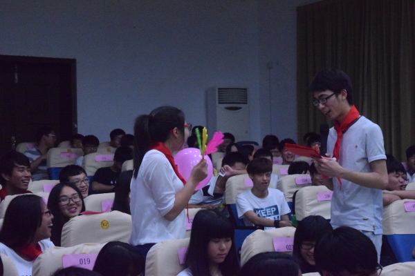 图为:游戏互动中活动伊时,由梁柯的一首“光荣”点燃的全场。紧着,文娱部带来的“儿歌串烧”再次将活动的推向高潮。随后,在游戏环节由“红领巾”队和“大队长”对各派成员参与,胜利的为自己所在的队加上一分,最终以积分多的队伍获胜,最终赢得大奖。“猜猜这是谁”环节屏幕投出各主席部长儿时照让我们也体会了一把现在流行的穿越, “疯狂猜歌”环节,同学们搜寻着记忆,童年歌曲的旋律带我们重温了儿时的潮流。“眼观六路”,更是将我们的游戏推向高潮,一部部经典的动画片,让同学们重温了儿时。儿时的游戏不禁让台下的观众踊跃上台试试,回味儿时的乐趣。在活动的最后,“大队长”队赢得了胜利,队伍中抽取一名幸运的同学,场下的观众都热情的呼应,就像儿时期待礼品的降临。