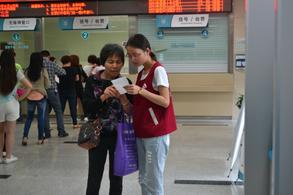 图为:志愿者正在帮患者取化验单 在每个区域每个楼层,都能看到穿着红色马甲的志愿者,他们热情地帮助病人挂号、取化验单,耐心地解答各种疑问,热心地引导患者到相应的诊室就诊,随时留心身边行动不便,需要帮助的人。在活动过程中,他们各司其职,且互相帮助,他们力量虽小,却尽其所能。他们时时刻刻以病人为中心,用热情的笑脸,诚恳的态度,为求医者提供了贴心的服务。