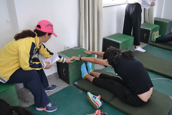 图为:学生正在进行坐位体前屈测试 800米、1000米是许多同学的一大难题,但是在今天,没有同学懈怠偷懒,更没有出现作弊的现象。炎热的天气并没有影响测试的进行,测试期间,每一位同学认真对待,拼尽全力。红色跑道上,参加测试的同学蓄势待发,随着一声口令,迈出了矫健的步伐。站在终点的裁判们、同学们都在为那些奋力奔跑的同学们呼喊鼓劲,一切都进行的十分顺利。跑道旁还设立了医疗服务站,校医随时准备着为那些需要帮助的同学们服务。