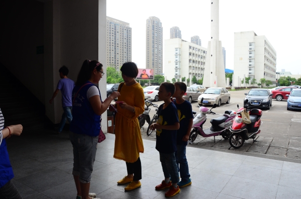 图为:义工同学正在发入场号给家长和小朋友