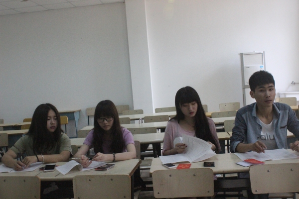 首先,四位同学起立共唱团歌,幻灯片上投放的照片鲜红明亮。在庄严嘹亮的团歌中,同学们端重站立,神态肃穆。接下来宣读入团人员名单,在场的四名同学可以清清楚楚地听到,自己的姓名将会被打上团员的烙印,也意味着自己的肩上多了一份光荣的责任。他们胸前佩戴着团徽,在宣誓人的带领下,向组织表明自己入团的决心。宣誓完毕后,工作人员向入团的同学们仔细地讲解他们所需要填写的相关文件。在工作人员的悉心讲解下,大家都很好地完成了申请书的填写。