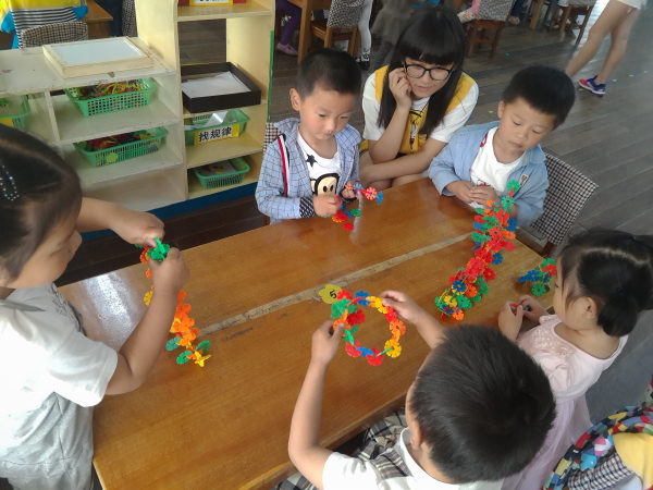 与此同时,另外一队被分到任务的志愿者负责和小朋友玩游戏,他们与小朋友们坐在一起,一起用“雪花片片”拼出各种各样的模型,小朋友们在这个环节中充分地发挥了想象力,对于自己搭建的“模型飞机”,“模型帆船”等等十分满意,在游戏结束后,小朋友们在老师和志愿者们的帮助下把“雪花片片”拆掉,统一放到塑料筐里,并将游戏桌子整理干净。