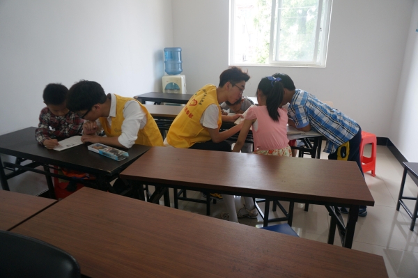 图为:志愿者们正在辅导小朋友做作业