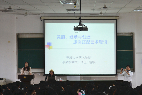 为提升大学生服装搭配意识,改善大学生精神面貌。201564日下午1330分,由我校团委主办、工商学院学习部承办的宁波文化百科九讲堂第703讲在精技楼503教室举行。本次讲座邀请了宁波大学艺术学院李采姣教授主讲,我分院大一各班学生参加了此次讲座。