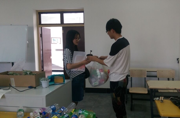 据悉,在活动开始前几天,便发布了此次活动的相关信息,不少同学兴致勃勃,想要交换绿色植物。活动还未开始时,便远远看到有同学提着一大袋塑料瓶来到教室外等候。交换绿色的规则是一个塑料瓶相当于0.5元,根据瓶子的数量,计算等量的价钱,用来交换不同价格的绿色植物,植物盆栽的价格在10元-30元不等。