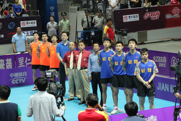 图为:活动现场 志愿者们来到赛场,在指定的座位上就坐。首先映入眼帘的是一颗乒乓球,它来回跳跃着仿佛一个精灵,而赋予它生命的是宁波队的马龙和天津队的马特。说起马龙相信大家都不陌生,他是现任中国乒乓男队队长也是第一个男子单打世界冠军,还是世界排名的第一人被称为“亚洲第一人”。现场的观众和同学们都为见到这样一位乒乓巨星兴奋不已。在简单的热身和开幕式后,激烈的比赛马上开始了。首先上场的当然是两队的队长马龙和马特。不负所望马龙以压倒性的优势拿下了第一局。首场比赛的胜利也大大鼓舞了宁波队的士气。第二次比赛由闫安对战庄智渊,这场比赛两人拼的是难解难分,比分一直咬的死死的。前三局闫安以2比1的成绩暂时领先,第四局的时候天津队的庄智渊顶住了压力以14:12的比分将比赛拉回了起跑线。最后一场比赛更是惊心动魄,最后闫安抓住了对手的一个小失误取得了最后的胜利。观众们和志愿者们为他送去了最响亮的掌声。接下来的比赛虽然天津队奋力反抗,可还是无法挽回劣势。最后由宁波海天塑机再次拿下了胜利。让我们恭喜宁波海天塑机!