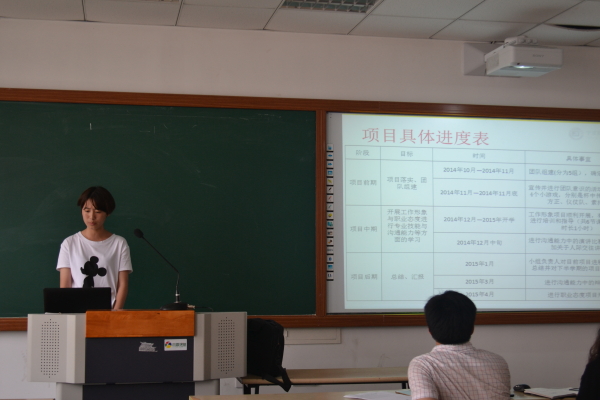 图为:营销3142班负责人正在ppt展示 通过本次大一班级特色项目答辩会,在鼓励同学们在学习之余通过各式各样的活动适当地放松心情、体验生活的同时,还为同学之间提供了良好的交流环境,营造了和谐融洽的氛围,既有利于加强团队意识,锻炼组织协调能力,又增进了友谊,增强了班级凝集力。工商学院 奚垚/文 叶茜茜/摄