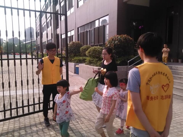 本次新蕾幼儿园的护苗任务由志愿者指导中心的陈丽晨同学带队,同行的还有三名志愿者。他们早早得来到新蕾世贸幼儿园,此时孩子们还没放学。他们便开始准备本次任务的相关事宜,分配工作,站好自己的岗位,等待孩子们放学。