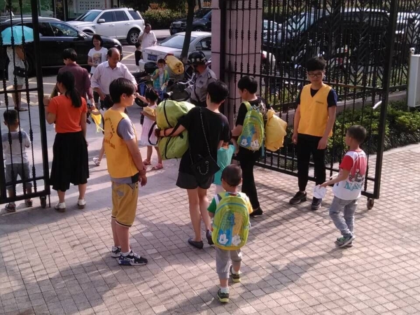 接近放学的时间,校门口已经停满车辆,志愿者们也整齐地站在自己的岗位上。下课铃声响起,家长们带着孩子们走出校园,孩子们懂事地向志愿者们挥手“哥哥,再见!姐姐,再见!”。当家长和孩子们需要帮助时,志愿者们总是即时的伸出手,他们也提示家长们正确地停放车辆,保证着孩子们放学时的交通。