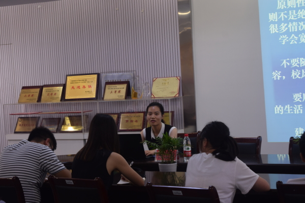 为更好地提高学生的综合素质,真正落实成功教育理念,培养具有 “阳光、热情、自信、积极” 的企业首选学生。电信学院成功大学班于 2015  6 18 日下午 16点在敬业楼党员之家召开成功大学第五次课程。本次课程的主讲老师是电信学院辅导员陈洁琼老师。本期成功大学的 30 余名学员参加了讲座。