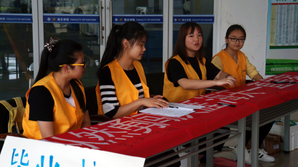 2015年6月18日上午七时,海天楼下,由志愿者指导中心的王旭波带队的一群志愿者早早地就开始忙碌了。一小时后,毕业生们就要返校了,这是他们在海天共同度过的最后一天。志愿者们在这天要让这些学长学姐们留下与海天美好的回忆,因为海天永远是他们的家。